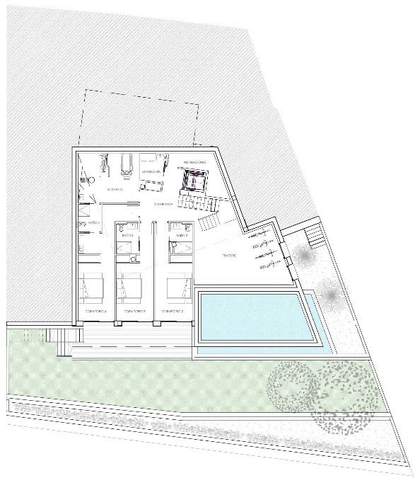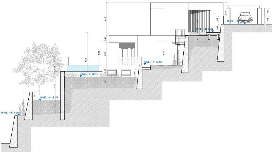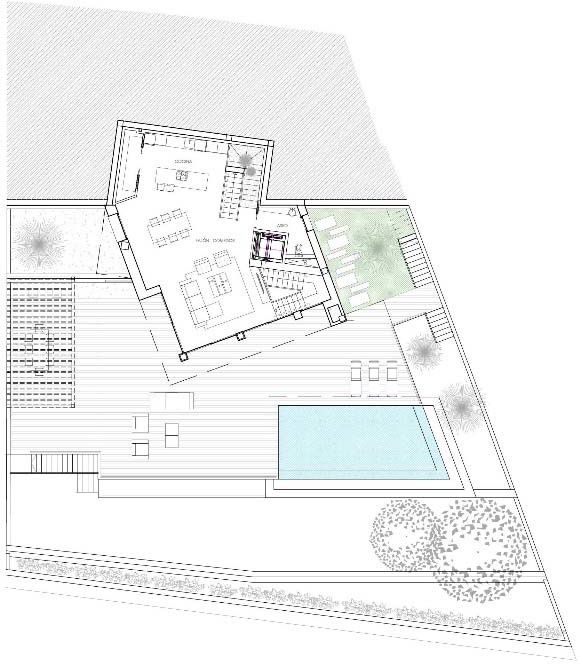 La organización de la vivienda está profundamente condicionada por la geometría de la parcela, por el desnivel existente y por la búsqueda de vistas y orientaciones. Como resultado, la vivienda se distribuye mediante un esquema de superposición, donde en cada nivel se organiza una parte del programa interno. De esta forma se consigue: Generar de forma clara el acceso a la vivienda.