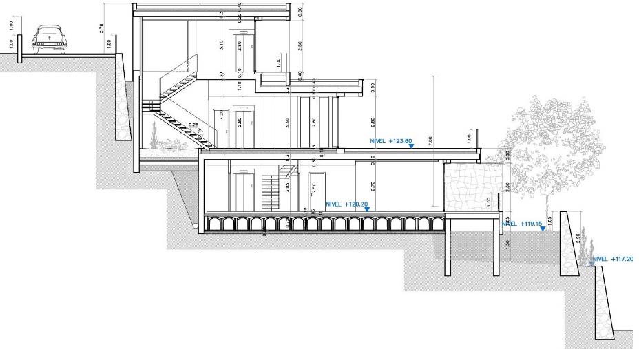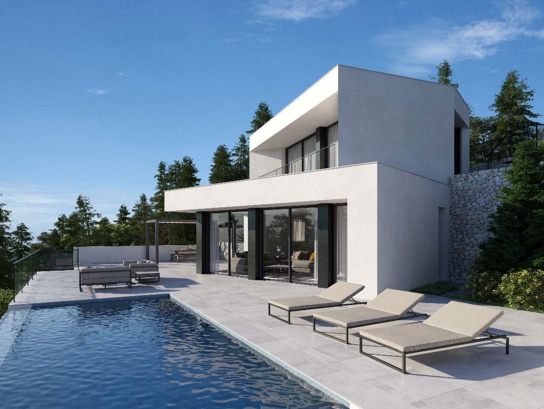 El proyecto se desarrolla con una voluntad de lectura volumétrica rotunda y unitaria. La organización de la vivienda está profundamente condicionada por la geometría de la parcela, por el desnivel existente y por la voluntad de que todas las estancias nobles tengan vistas al mar y orientación sur. Teniendo esto en cuenta, la concepción volumétrica se resume en la superposición de dos volúmenes claros, puros y rotundos que como si de dos grandes rocas se tratara, se apoya uno sobre el otro, girados uno respecto del otro, de forma que el volumen de planta 1ª se alinea con la calle y el volumen de planta baja se alinea con el linde este de la parcela. La planta semisótano queda totalmente enterrada por todos los lados menos por el frente de fachada. Al quedar ésta revestida con piedra, este nivel se integra en el terreno y se mimetiza con él, dando la sensación que se trata de un muro de bancal parcialmente perforado. La posición estratégica de cada nivel,  desplazados entre sí permite: Generar de forma clara el acceso a la vivienda.