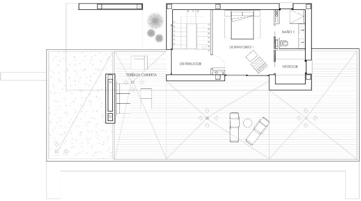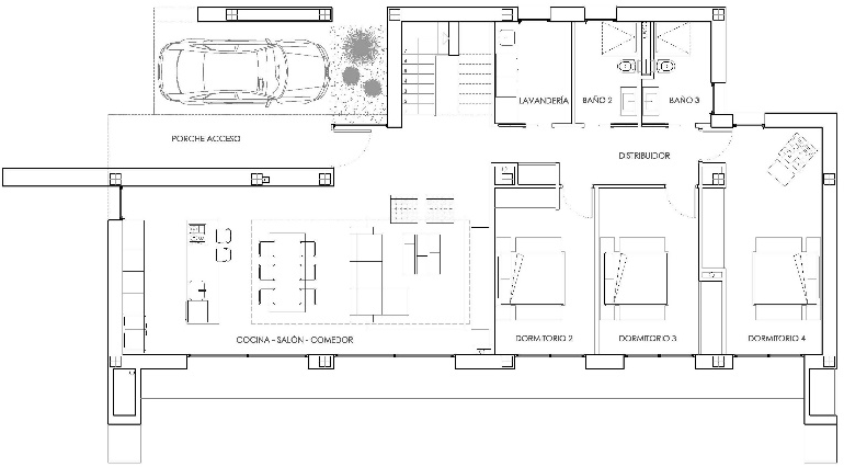 Esta estructura permite organizar de forma clara y sencilla el programa de necesidades interno sin interferencias de circulaciones entre las distintas zonas de día y noche.