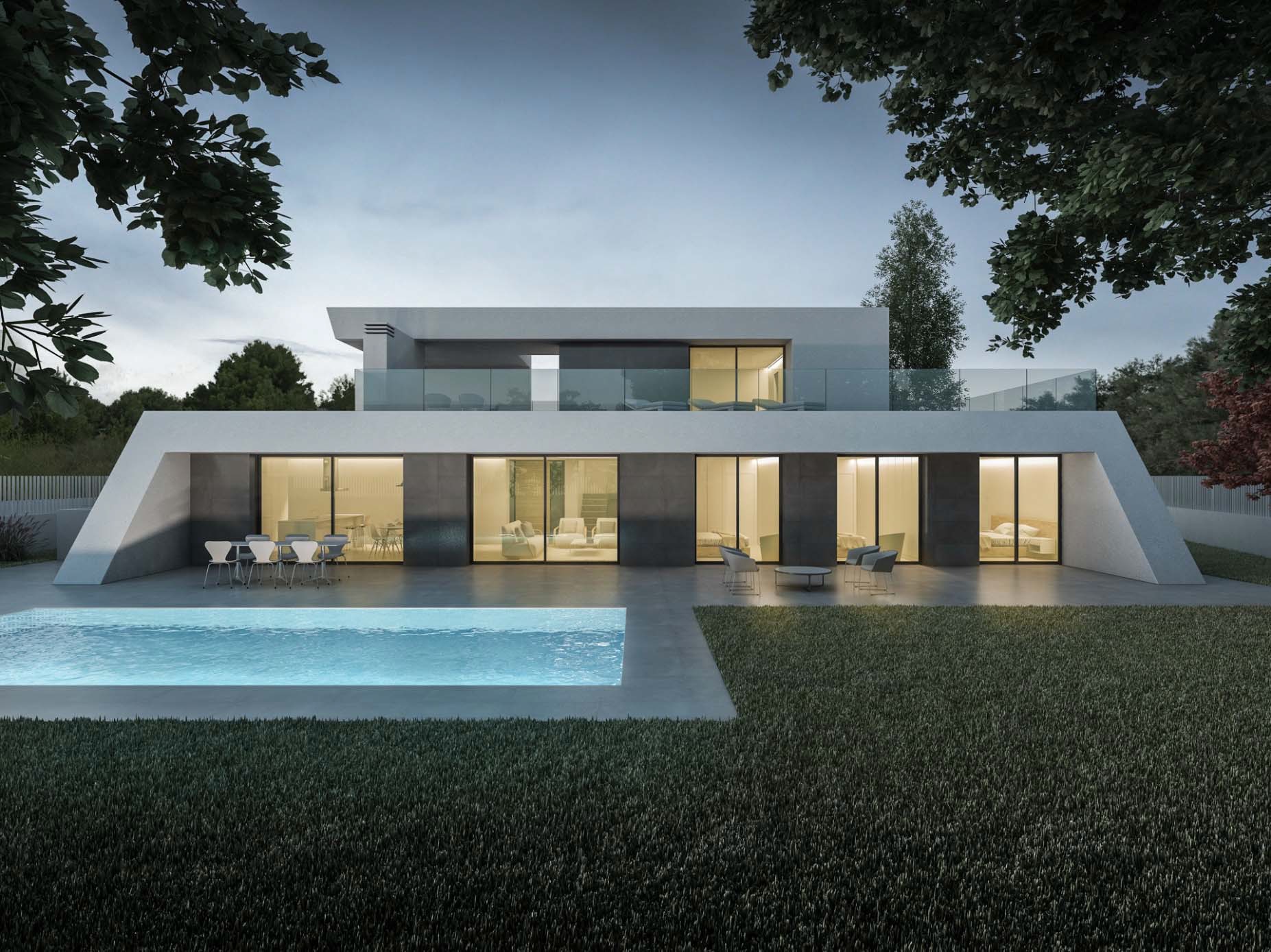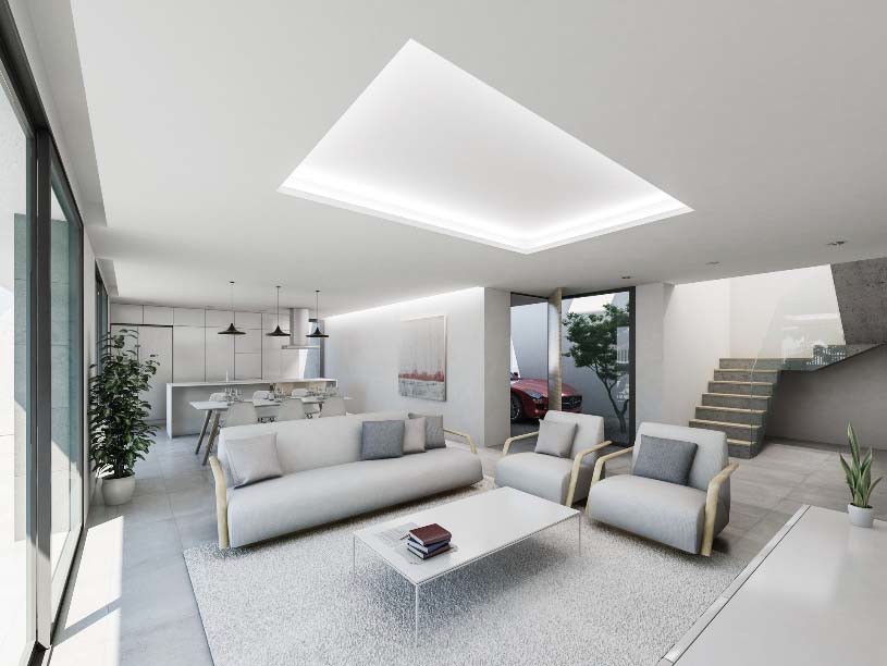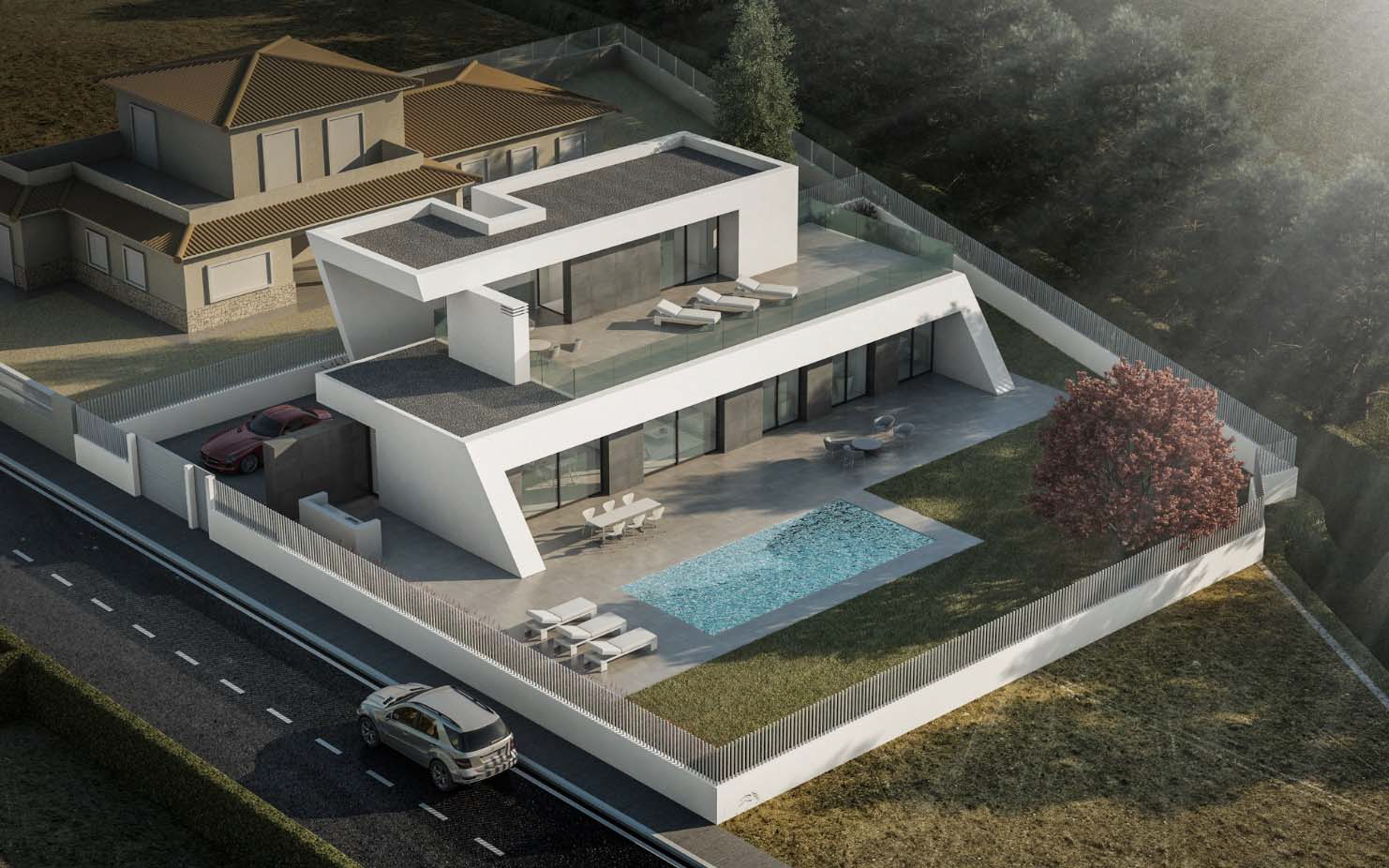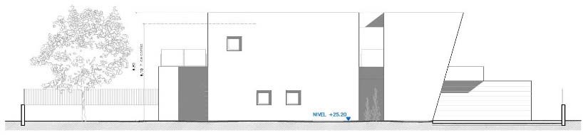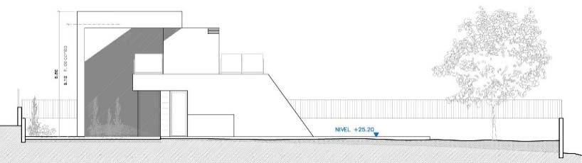 Partiendo de esta idea de continuidad, el edificio se entiende como una macla entre dos volúmenes, el primero con una marcada horizontalidad contiene la mayor parte del programa en planta baja, compacto en tres de sus lados y muy abierto en la orientación sur. El segundo, creciendo por detrás del primero, configura una barrera en la fachada norte que protege de la cercanía de los vecinos y de las condiciones climáticas de esta orientación, se eleva y se apoya sobre la cubierta de aquel, configurando, en la fachada sur, el dormitorio principal conectado con una amplia terraza y, en el lado oeste, se genera un espacio exterior, a doble altura, que marca el acceso a la vivienda y delimita la zona de aparcamiento.