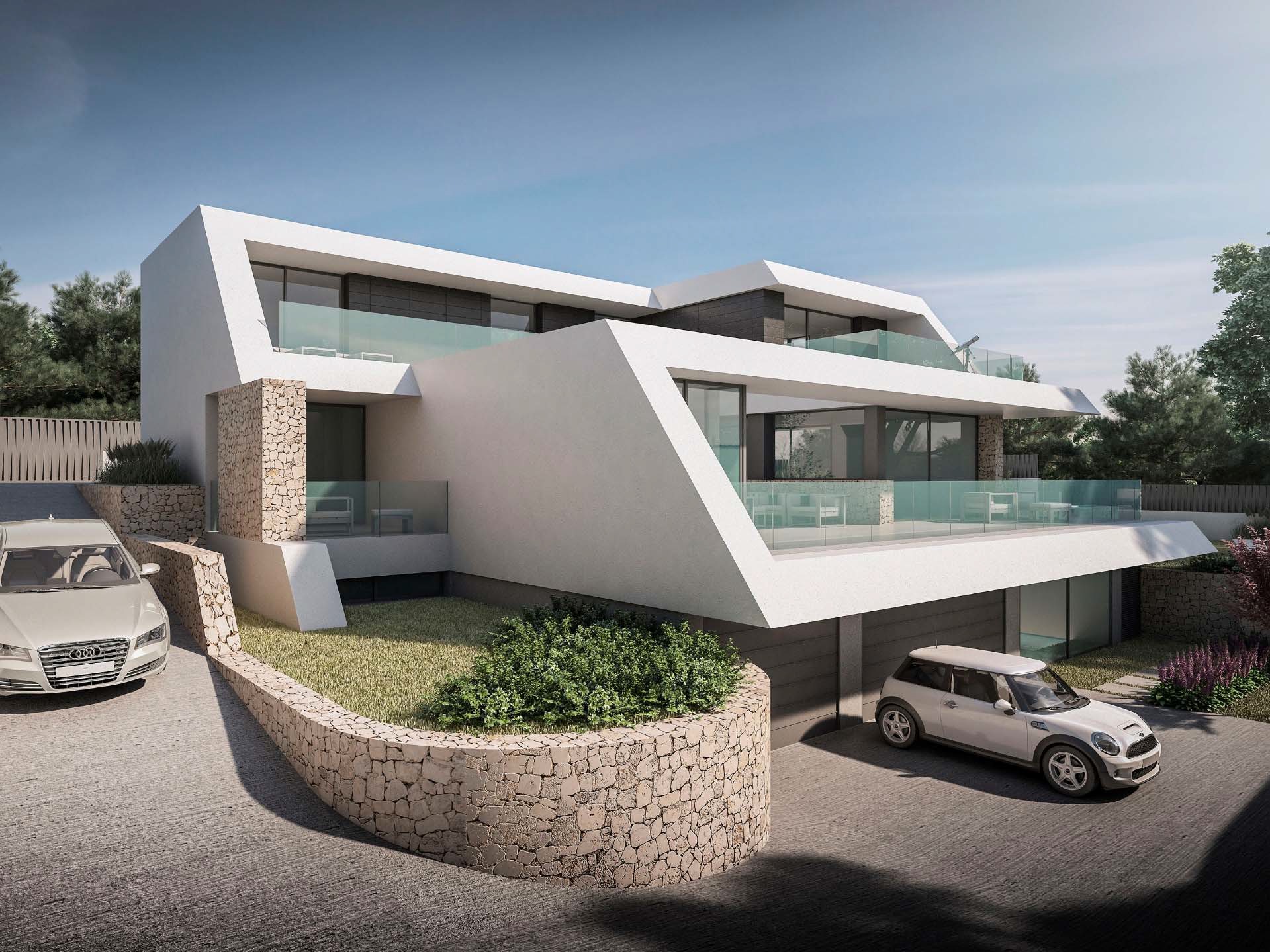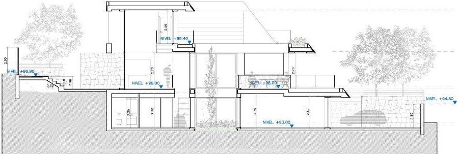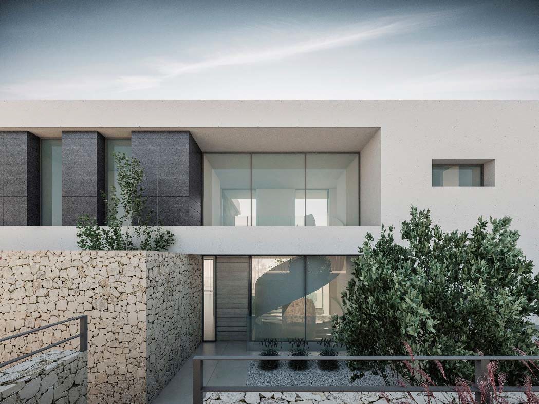 El proyecto se desarrolla con una voluntad de lectura rotunda, configurándose un volumen formado por un conjunto de bandejas que se obren al Sur, compacto y unitario. Con una clara apertura hacia el Mar, destaca la presencia de un patio ajardinado central como el corazón de la vivienda, como el elemento que articula las estancias principales en torno a él. Todas las estancias y espacios de circulación se abren al patio, cobrando gran relevancia desde cualquier punto de la casa. También se destaca el fajón inclinado de fachada Sur, marcando la clara direccionalidad del volumen en su apertura al Mar. En definitiva, se trata de un volumen blanco rotundo con bandejas que se abren al Mar, y penetrado verticalmente por un patio que articula todo el programa de la vivienda.
